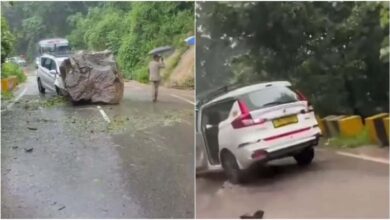 स्वास्थ्य विभाग की टीम की कार पर पहाड़ से गिरा बोल्डर