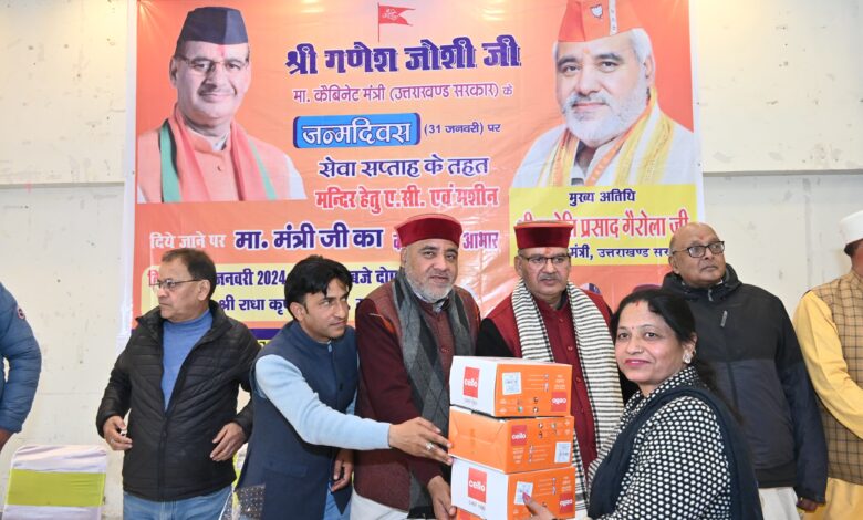 इस अवसर पर कैबिनेट मंत्री गणेश जोशी और मुख्य अतिथि ज्योति प्रसाद गैरोला द्वारा मसूरी श्रीराधाकृष्ण मंदिर के लिए 06 ए.सी. एवं स्वयं सहायता समूहों को महिलाओं को 10 सिलाई मशीन की वितरित की गई। इस अवसर पर पार्टी कार्यकर्ताओं द्वारा कैबिनेट मंत्री गणेश जोशी को जन्म दिवस की अग्रिम बधाई एवं शुभकामनाएं देते हुए उनके लंबी उम्र की कामना की। कार्यक्रम में पहुंचे दर्जाधारी राज्यमंत्री ज्योति प्रसाद गैरोला ने कैबिनेट मंत्री गणेश जोशी को जन्म दिवस की अग्रिम बधाई एवं शुभकामनाएं देते हुए उनके दीर्घयु की कामना की। उन्होंने कहा मंत्री गणेश जोशी अपनी राजनीतिक पारी में गरीब वंचितों से जुड़कर सेवाभाव से कार्य करते है। उन्होंने कहा मंत्री गणेश जोशी कोई भी गरीब वंचितों की मदद के लिए हमेशा आगे रहते है। उन्होंने कहा जब किसी गरीब असहाय लोगों की मदद के लिए हाथ आगे उठते है,उसका आशीर्वाद जरूर मिलता है। उन्होंने कहा राजनीतिक क्षेत्र में जितना मुश्किल काम नही है। उन्होंने कहा मुश्किल लोगों का दिल जीतना है। उन्होंने कहा कैबिनेट मंत्री गणेश जोशी ने लोगों का दिल जीता है।