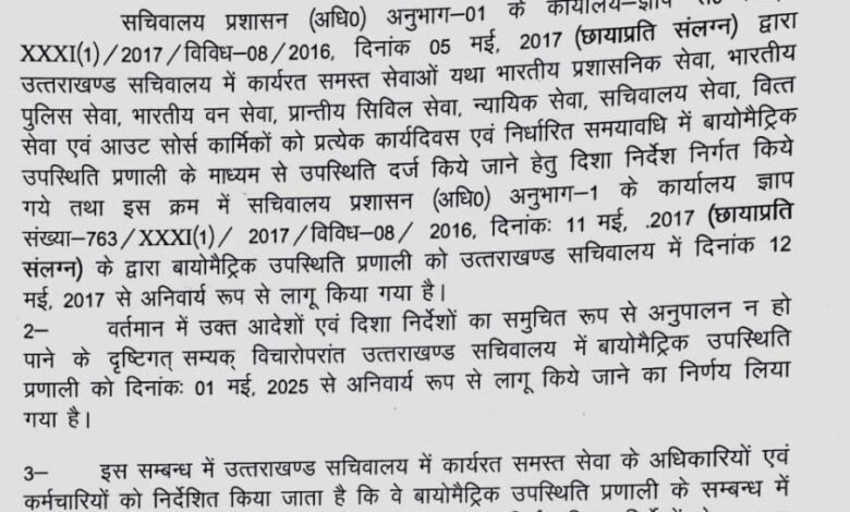 उत्तराखंड सचिवालय में बायोमेट्रिक हाजिरी अनिवार्य की गई मुख्य सचिव ने जारी किए आदेश