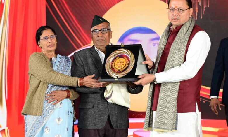 देहरादून। मुख्यमंत्री पुष्कर सिंह धामी ने शुक्रवार को सहस्त्रधारा रोड, स्थित एक होटल में उत्तराखंड अनन्य सम्मान कार्यक्रम में प्रतिभाग किया। इस दौरान मुख्यमंत्री ने शहीद सैनिकों के परिजनों को सम्मानित किया। मुख्यमंत्री ने शहीदों को श्रद्धांजलि अर्पित करते हुए कहा कि शहीदों के परिजनों का संघर्ष, पीड़ा और देश के प्रति अटूट निष्ठा हम सभी के लिए प्रेरणा है। उन्होंने कहा देवभूमि उत्तराखंड वीरभूमि के रूप में भी जाना जाता है। प्रदेश के लगभग प्रत्येक परिवार का सदस्य सेना या अर्ध सैनिक बलों से जुड़ा हुआ है। उत्तराखंड के वीर सपूतों ने अपने प्राणों की बाजी लगाकर मातृभूमि की रक्षा की है।