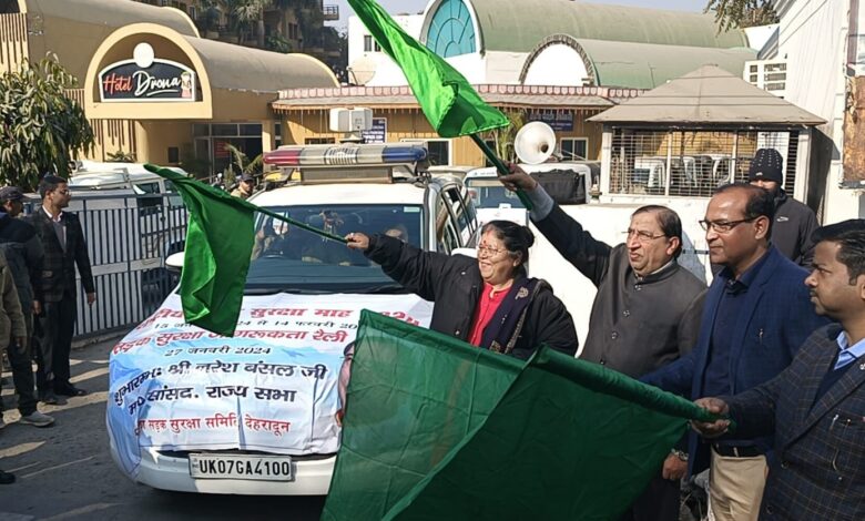 देहरादून। राष्ट्रीय सड़क सुरक्षा माह 2024, में सड़क सुरक्षा जागरूकता कार्यक्रम की श्रृंखलाओं में आज आयोजित सड़क सुरक्षा रैली को राज्यसभा सांसद नरेश बंसल द्वारा होटल द्रोण से हरी झण्डी दिखाकर रवाना किया यह जागरूकता रैली होटल द्रोण से संभागीय परिवहन विभाग के कार्यालय राजपुर रोड तक गई। उन्होंने कहा कि सड़क सुरक्षा हेतु जागरूकता की आवश्यकता है, प्रत्येक वर्ष लाखों लोग रैस ड्राईव के कारण दुर्घटना का शिकार होते हैं, लोगों का जीवन बचाने के लिए जागरूकता की आवश्यकता है इसलिए इस रैली का फ्लैग ऑफ किया गया हैै। कहा कि सरकार का यही प्रयास है कि दुर्घटनाओं में 50 प्रतिशत् से अधिक की कमी लाई जाए इसके लिए सड़कों का निर्माण एवं सुरक्षात्मक उपाय अपनाये जा रहे है। आम आदमी को जागरूक होने की आवश्यकता है। सड़क सुरक्षा रैली के अवसर पर पर संभागीय परिवहन अधिकारी प्रशासन शैलेश कुमार तिवारी, सहायक संभागीय परिवहन अधिकारी राजेन्द्र विराटिया, टीटीओ एमडी अनुराधा पंत, एवं आरटीओ की टीम व मैजिक एवं आटो के चालकध्परिचालक उपस्थित रहे।