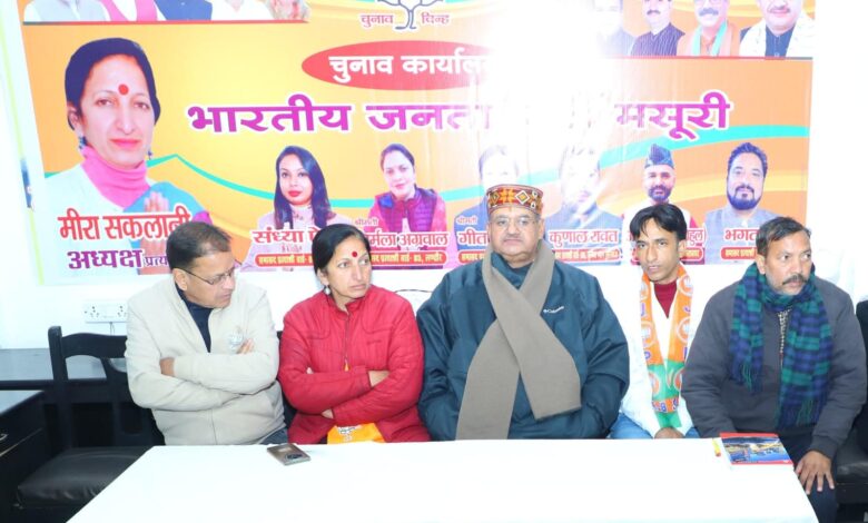 मसूरी। कैबिनेट मंत्री गणेश जोशी ने मसूरी में नगर पालिका अध्यक्ष प्रत्याशी मीरा सकलानी के चुनाव कार्यालय में प्रेस वार्ता की। प्रेस वार्ता के दौरान पत्रकारों को सम्बोधित करते हुए कैबिनेट मंत्री गणेश जोशी ने कहा कि मसूरी की जनता का अपार स्नेह और समर्थन भाजपा के साथ साफ नजर आ रहा है। उन्होंने कहा कि मसूरी में कमल खिलने जा रहा है। उन्होंने कहा शीघ्र ही 11 जनवरी को मेनिफेस्टो भी जारी किया जाएगा और उस मैनिफेस्टो में मसूरी के मुख्य मुद्दों को सम्मिलित किया जाएगा। उन्होंने कहा कि मसूरी नगर पालिका परिषद अध्यक्ष प्रत्याशी मीरा सकलानी के साथ ही भाजपा सभासद प्रत्याशी भी बड़े अंतर से विजय होंगे। उन्होंने कहा कि नगर पालिका अध्यक्ष प्रत्याशी की साफ सुथरी छवि और मृदुभाषिता से भी पार्टी को लाभ मिल रहा है। उन्होंने कहा कि निश्चित रूप से मसूरी में नगर पालिका अध्यक्ष भाजपा प्रत्याशी की जीत मसूरी के विकास कार्यों में एक नए आयाम स्थापित करेंगी। इस अवसर पर नगर पालिका अध्यक्ष प्रत्याशी मीरा सकलानी, मंडल अध्यक्ष राकेश रावत, मोहन पेटवाल, ओपी उनियाल, रजत अग्रवाल सहित कई लोग उपस्थित रहे।